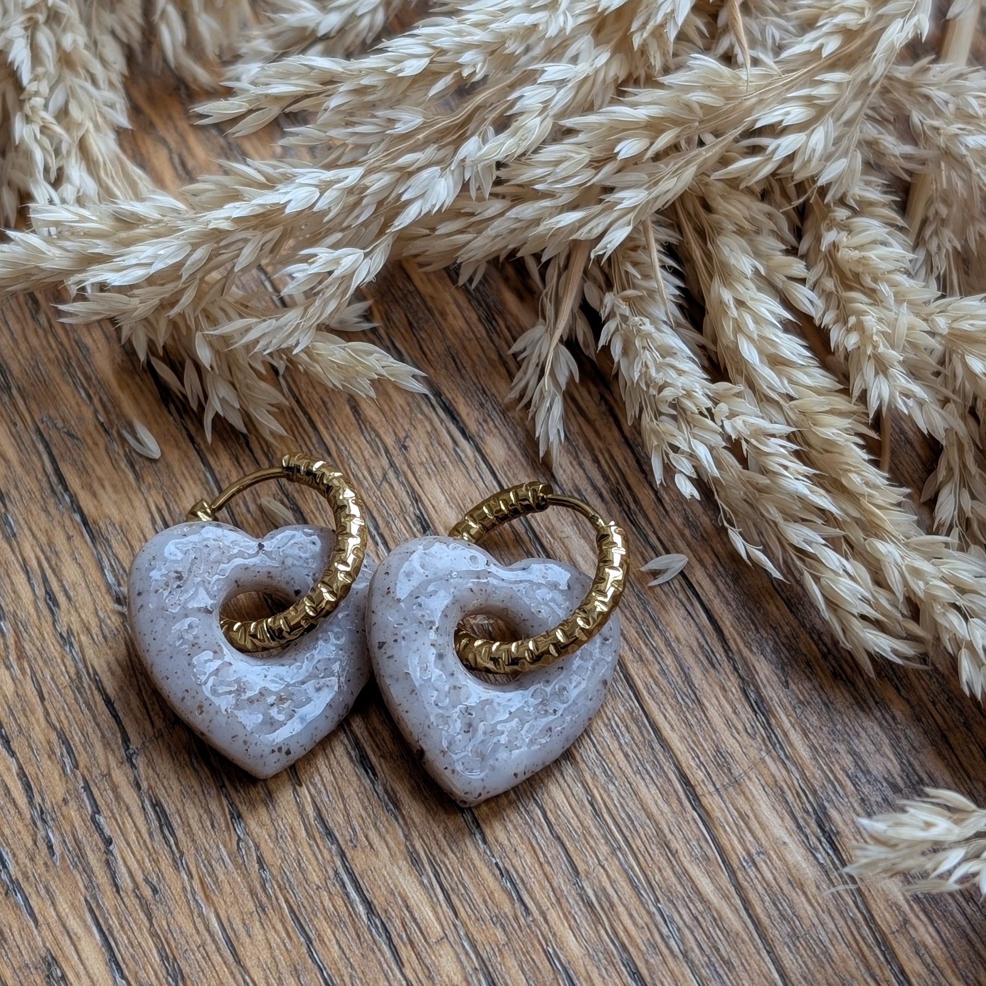 Laissez parler votre cœur avec ces créoles en acier inoxydable (or ou argent), ornées de sublimes pampilles en forme de cœur, façonnées à la main en pâte polymère puis résinées pour une brillance éclatante et une finition durable.