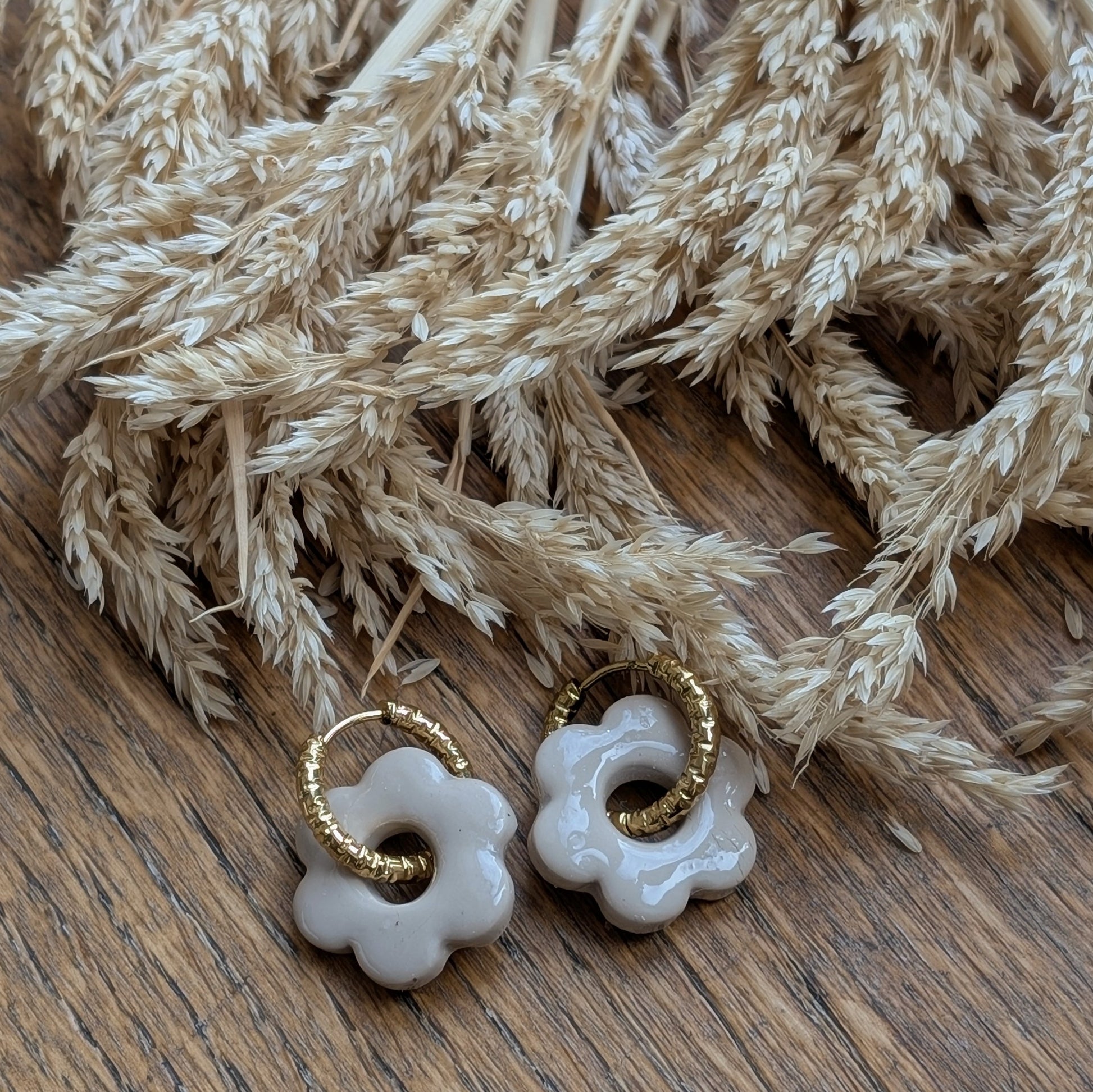 Laissez-vous charmer par ces créoles en acier inoxydable (or ou argent), sublimées par de délicates pampilles en forme de fleur, entièrement façonnées à la main en pâte polymère, puis résinées pour un éclat raffiné et une finition durable.