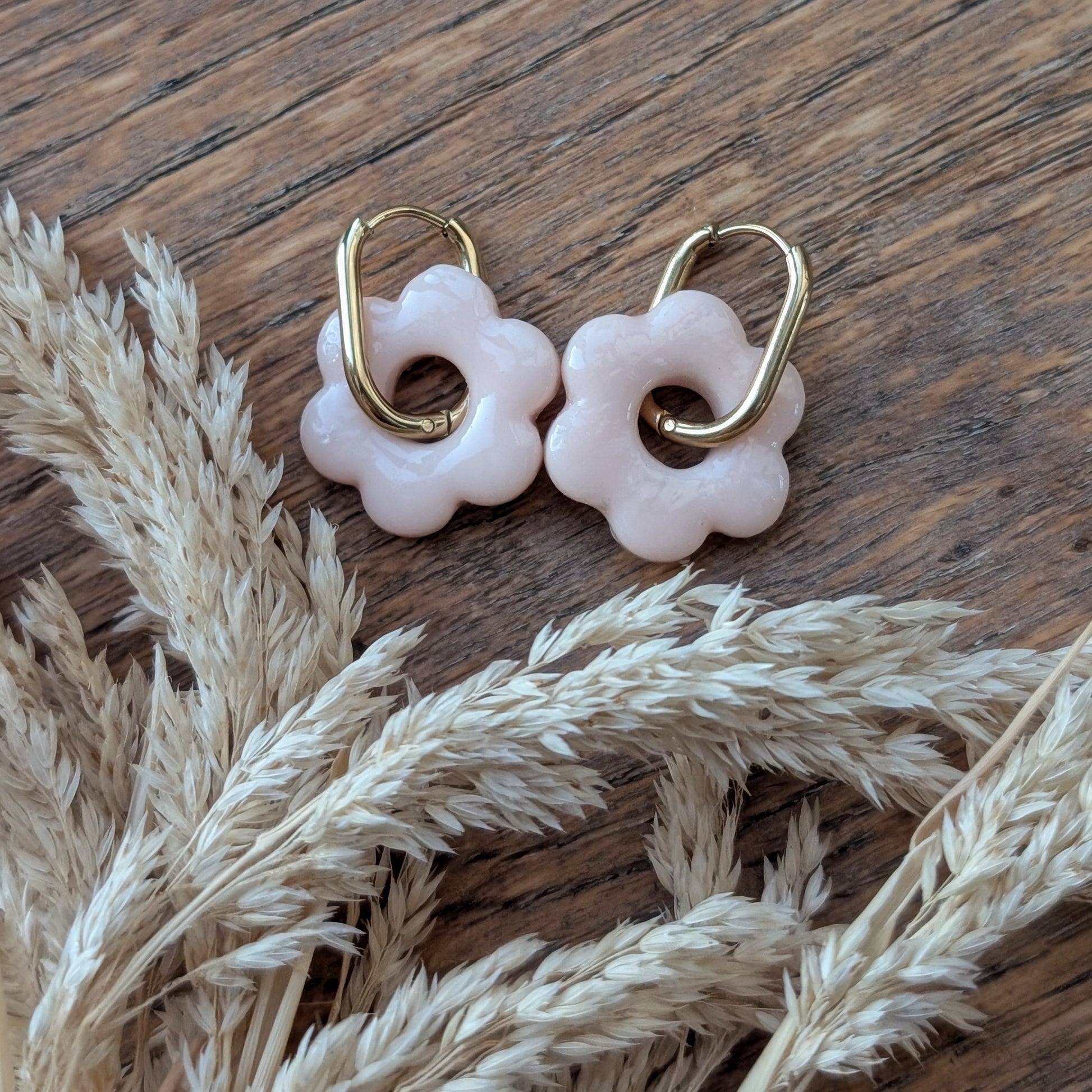 Laissez-vous charmer par ces créoles en acier inoxydable (or ou argent), sublimées par de délicates pampilles en forme de fleur, entièrement façonnées à la main en pâte polymère, puis résinées pour un éclat raffiné et une finition durable.