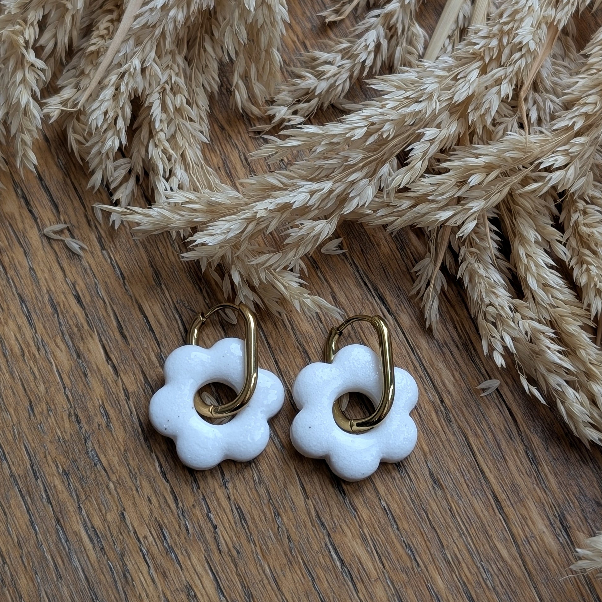 Laissez-vous charmer par ces créoles en acier inoxydable (or ou argent), sublimées par de délicates pampilles en forme de fleur, entièrement façonnées à la main en pâte polymère, puis résinées pour un éclat raffiné et une finition durable.