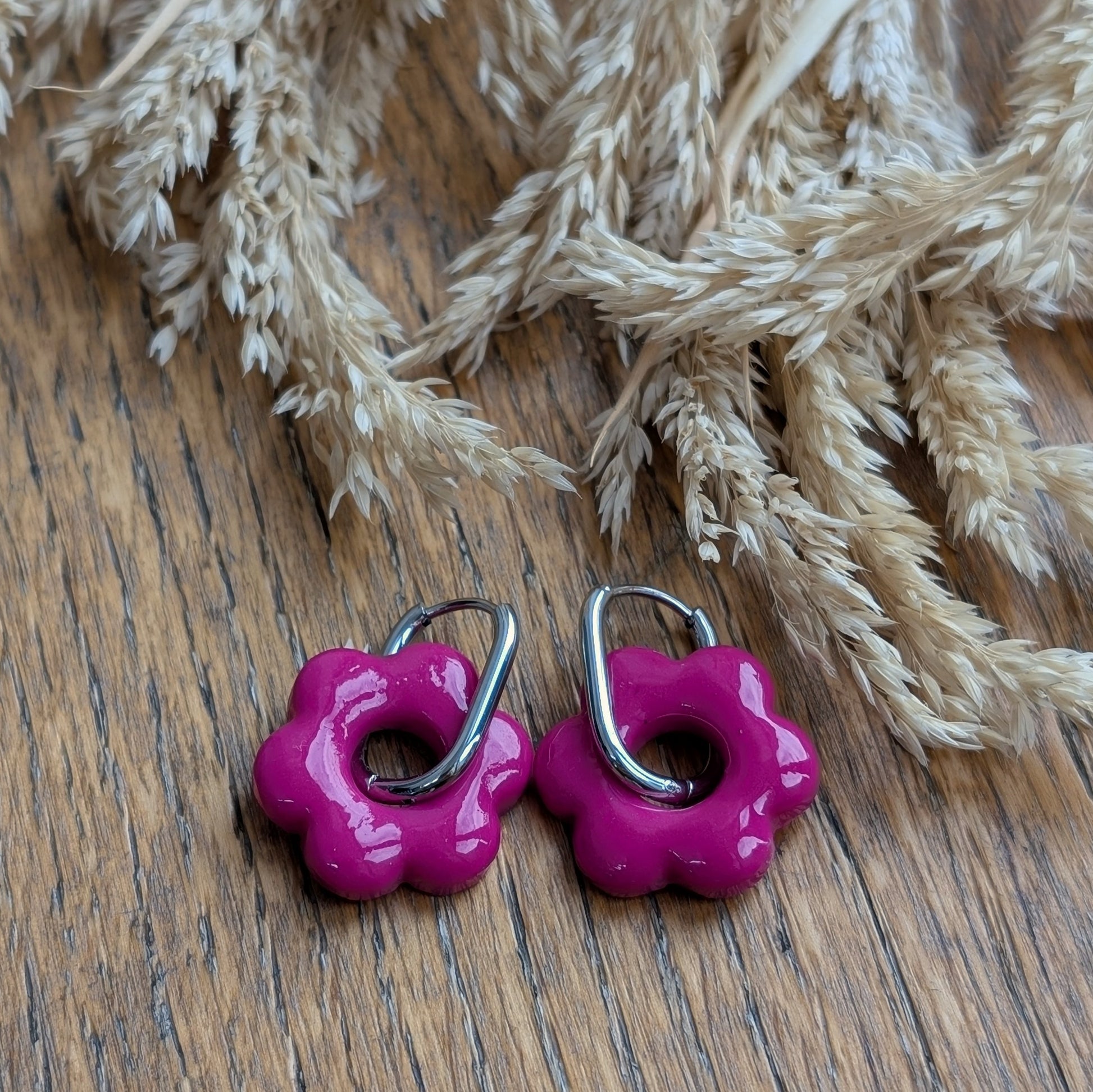 Laissez-vous charmer par ces créoles en acier inoxydable (or ou argent), sublimées par de délicates pampilles en forme de fleur, entièrement façonnées à la main en pâte polymère, puis résinées pour un éclat raffiné et une finition durable.