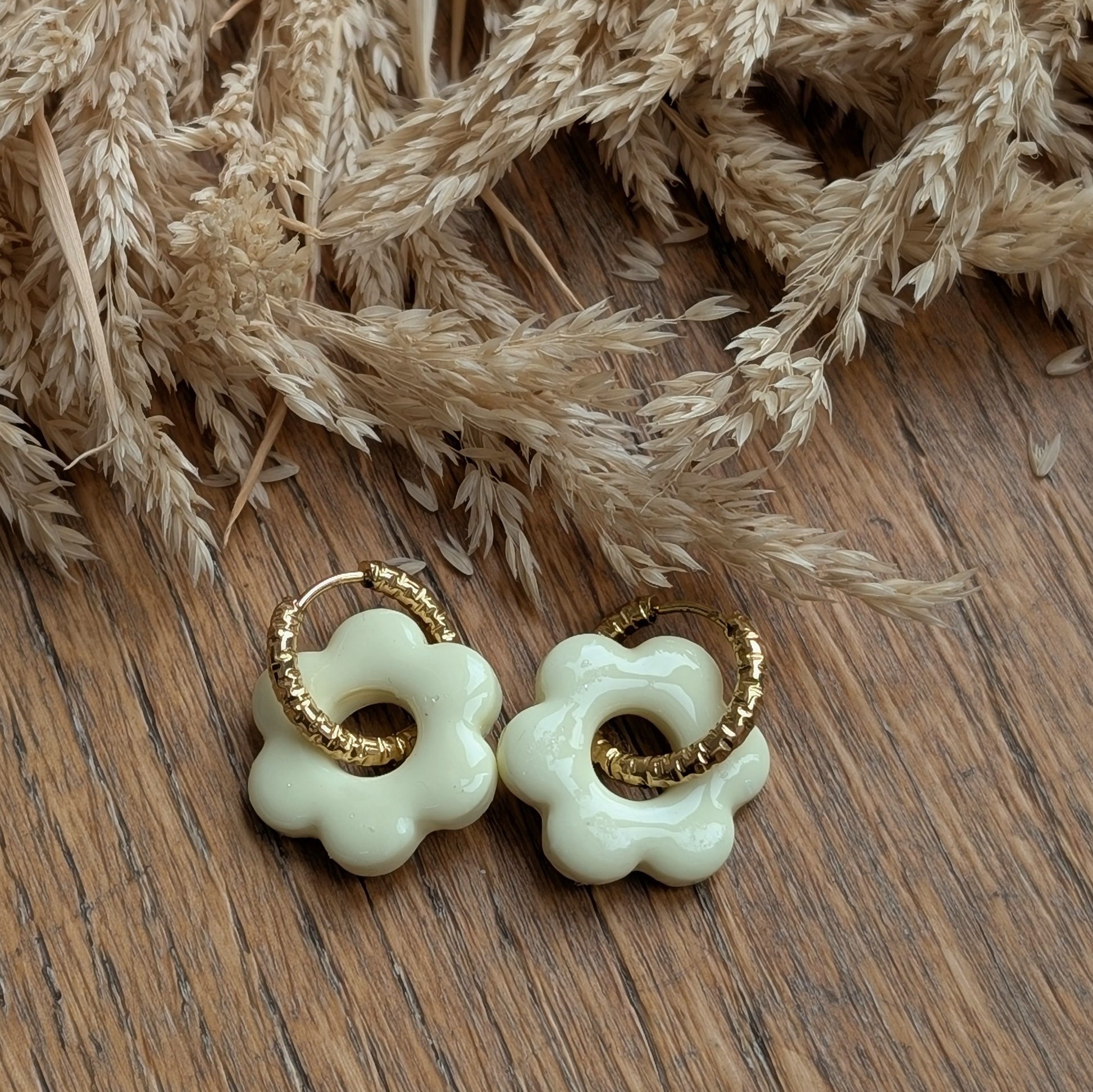 Laissez-vous charmer par ces créoles en acier inoxydable (or ou argent), sublimées par de délicates pampilles en forme de fleur, entièrement façonnées à la main en pâte polymère, puis résinées pour un éclat raffiné et une finition durable.
