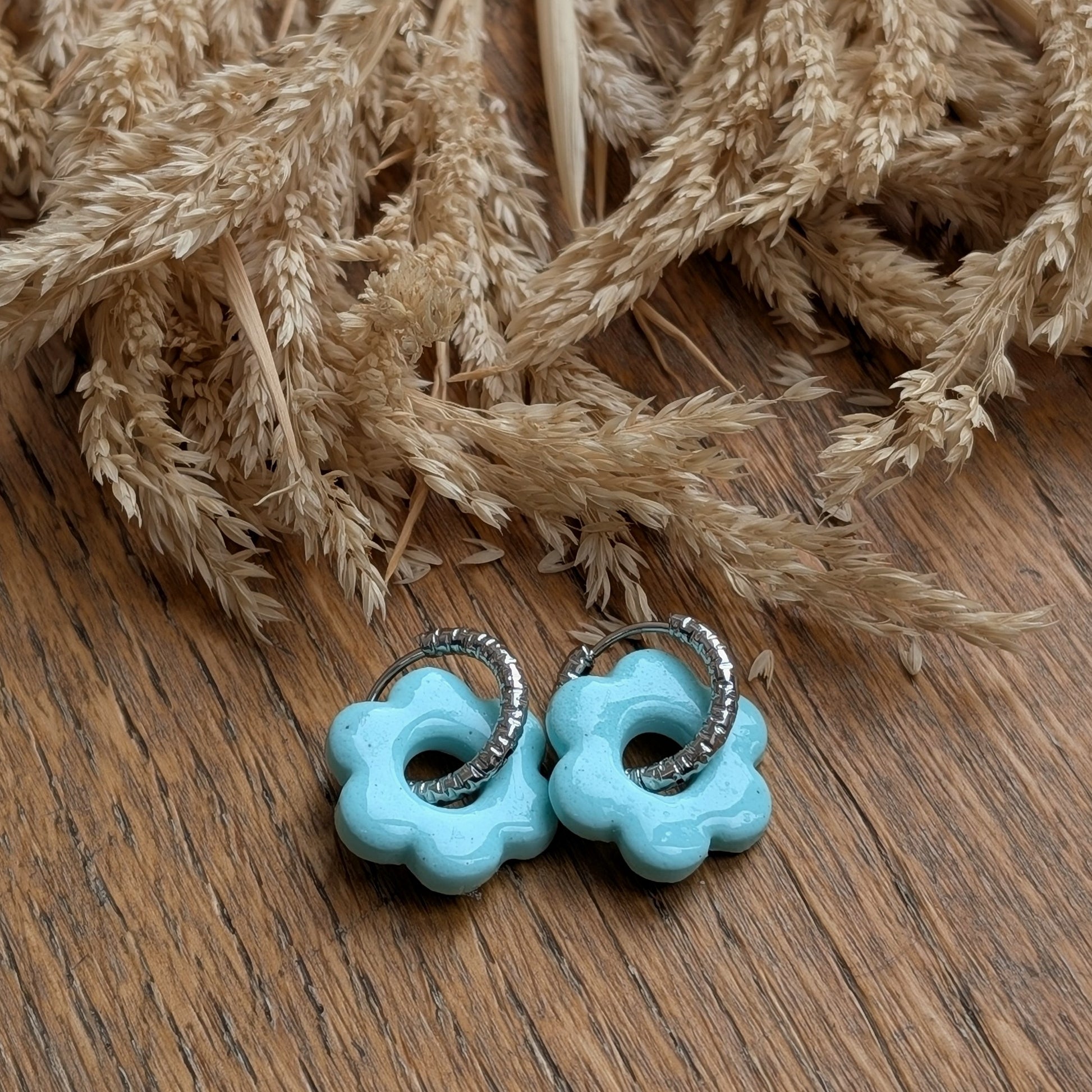 Laissez-vous charmer par ces créoles en acier inoxydable (or ou argent), sublimées par de délicates pampilles en forme de fleur, entièrement façonnées à la main en pâte polymère, puis résinées pour un éclat raffiné et une finition durable.