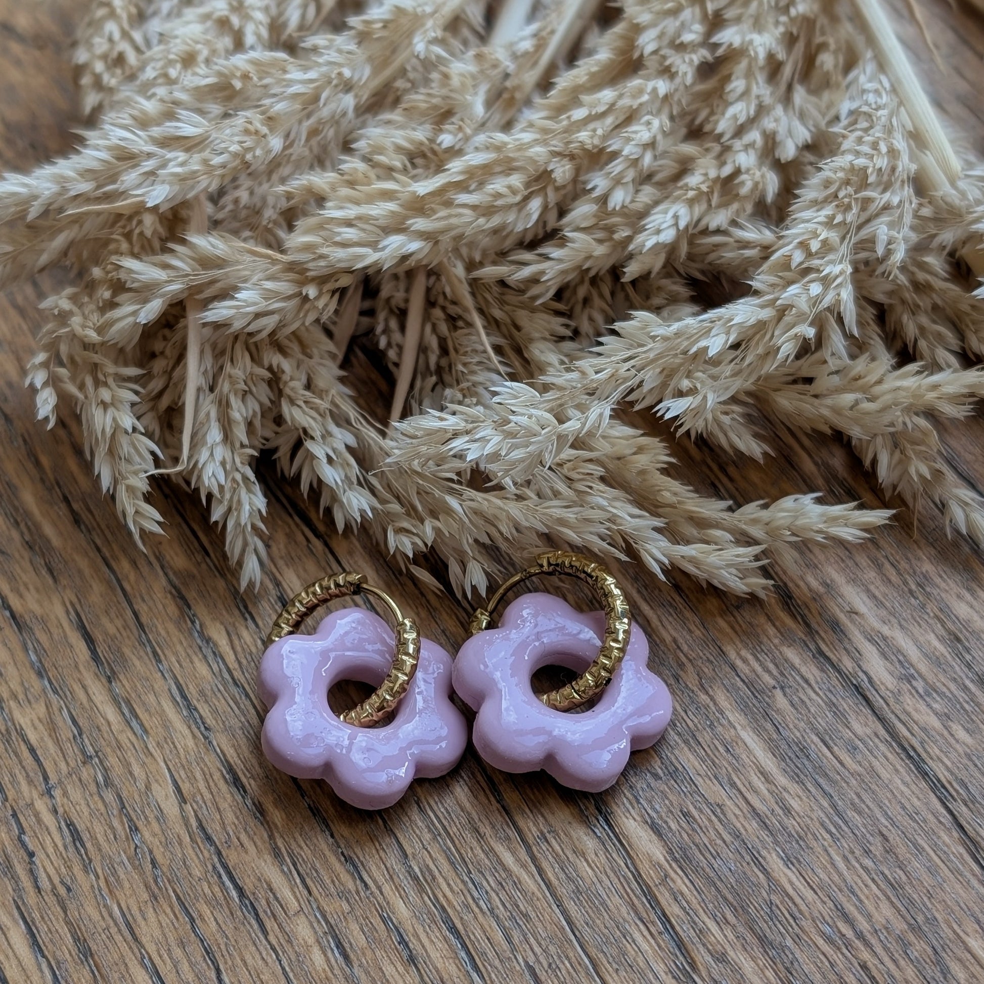 Laissez-vous charmer par ces créoles en acier inoxydable (or ou argent), sublimées par de délicates pampilles en forme de fleur, entièrement façonnées à la main en pâte polymère, puis résinées pour un éclat raffiné et une finition durable.