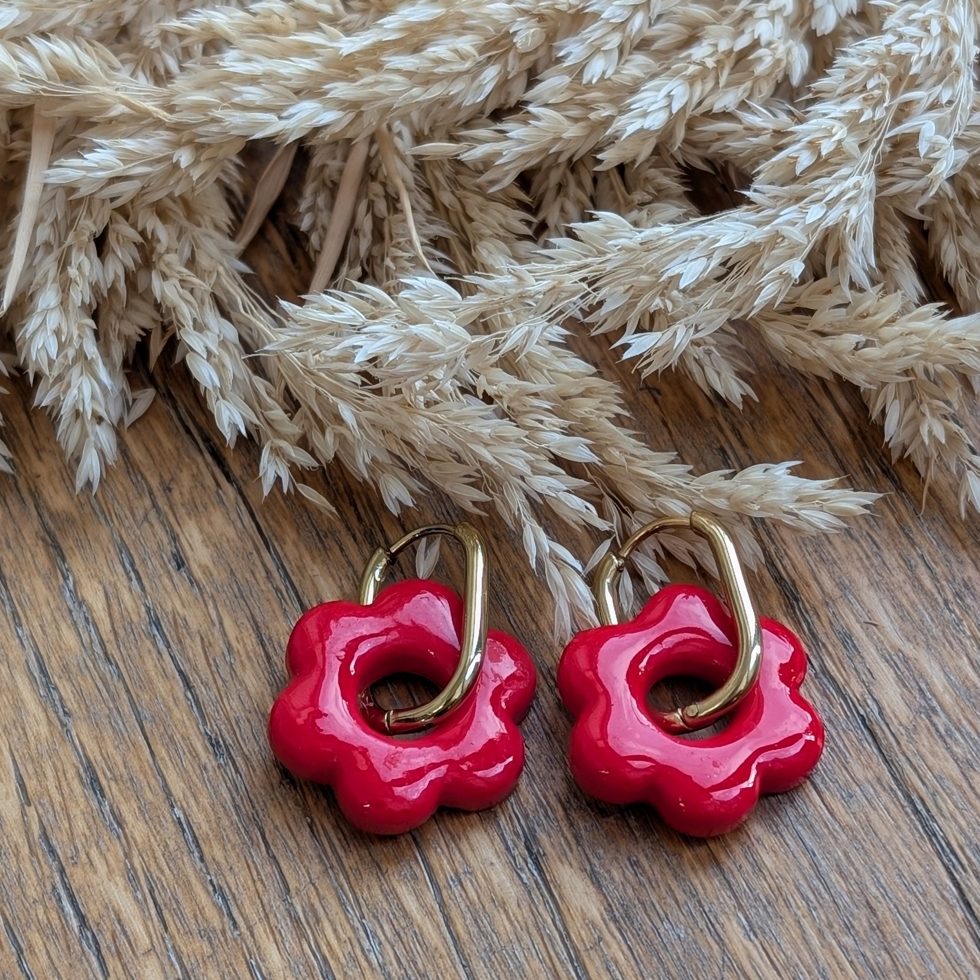 Laissez-vous charmer par ces créoles en acier inoxydable (or ou argent), sublimées par de délicates pampilles en forme de fleur, entièrement façonnées à la main en pâte polymère, puis résinées pour un éclat raffiné et une finition durable.