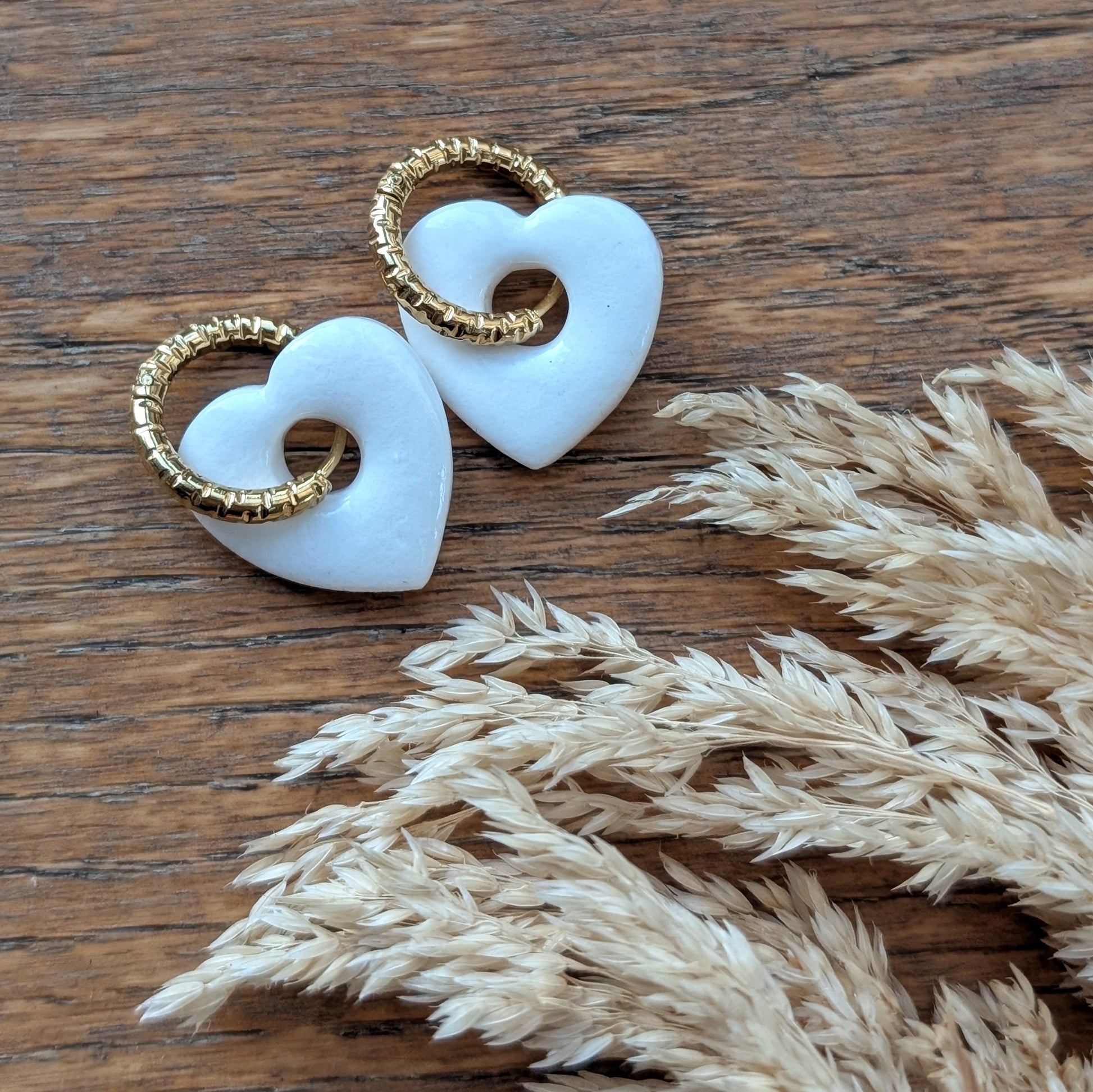 Laissez parler votre cœur avec ces créoles en acier inoxydable (or ou argent), ornées de sublimes pampilles en forme de cœur, façonnées à la main en pâte polymère puis résinées pour une brillance éclatante et une finition durable.